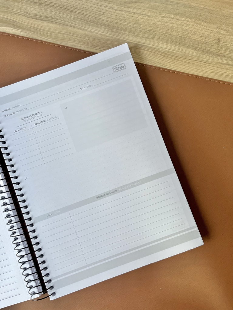 Capa: dura Espiral: colorido Folhas: pautadas Formato: 200mm x 275mm Gramatura: 56 g/m² Número de folhas: 192 folhas Número de matérias: 12 matérias Produto certificado: FSC